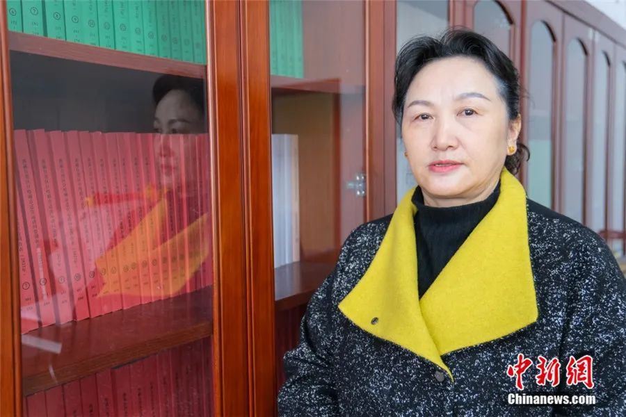 3月20日,巴桑卓玛在办公室,其身后是近年在西藏各地调研的资料。图/中新社