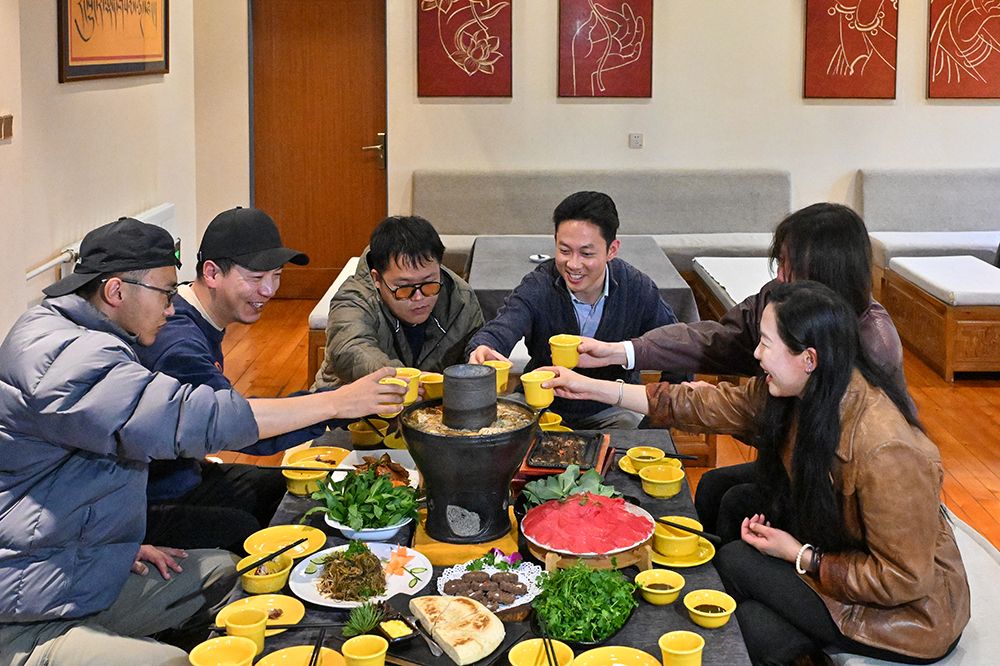 3月2日,扎西培楚(右三)与朋友们举杯团聚,品尝藏式火锅。图/中新社