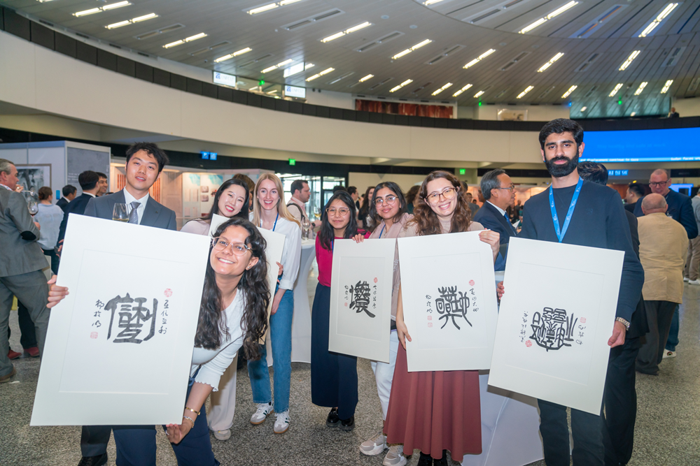 14日,庆祝2025年联合国中文日系列活动在维也纳联合国总部开幕。图为当日来宾展示书法作品。图/中新社