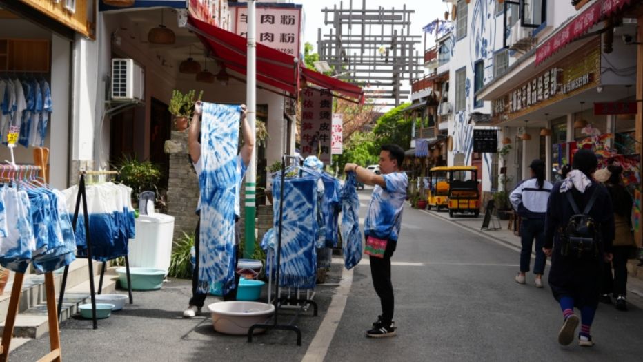4月14日,贵州省兴义市下纳灰村,手工艺人在晾晒扎染的衣物,游客在村里闲逛。图/中新社