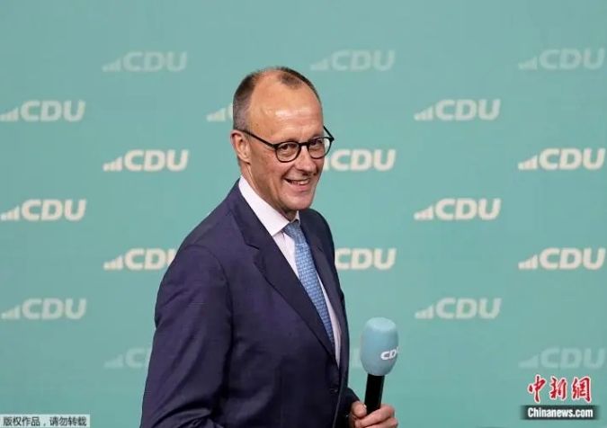 当地时间2025年2月23日,德国柏林,联盟党主席、总理候选人默茨在党总部上台向支持者发言。