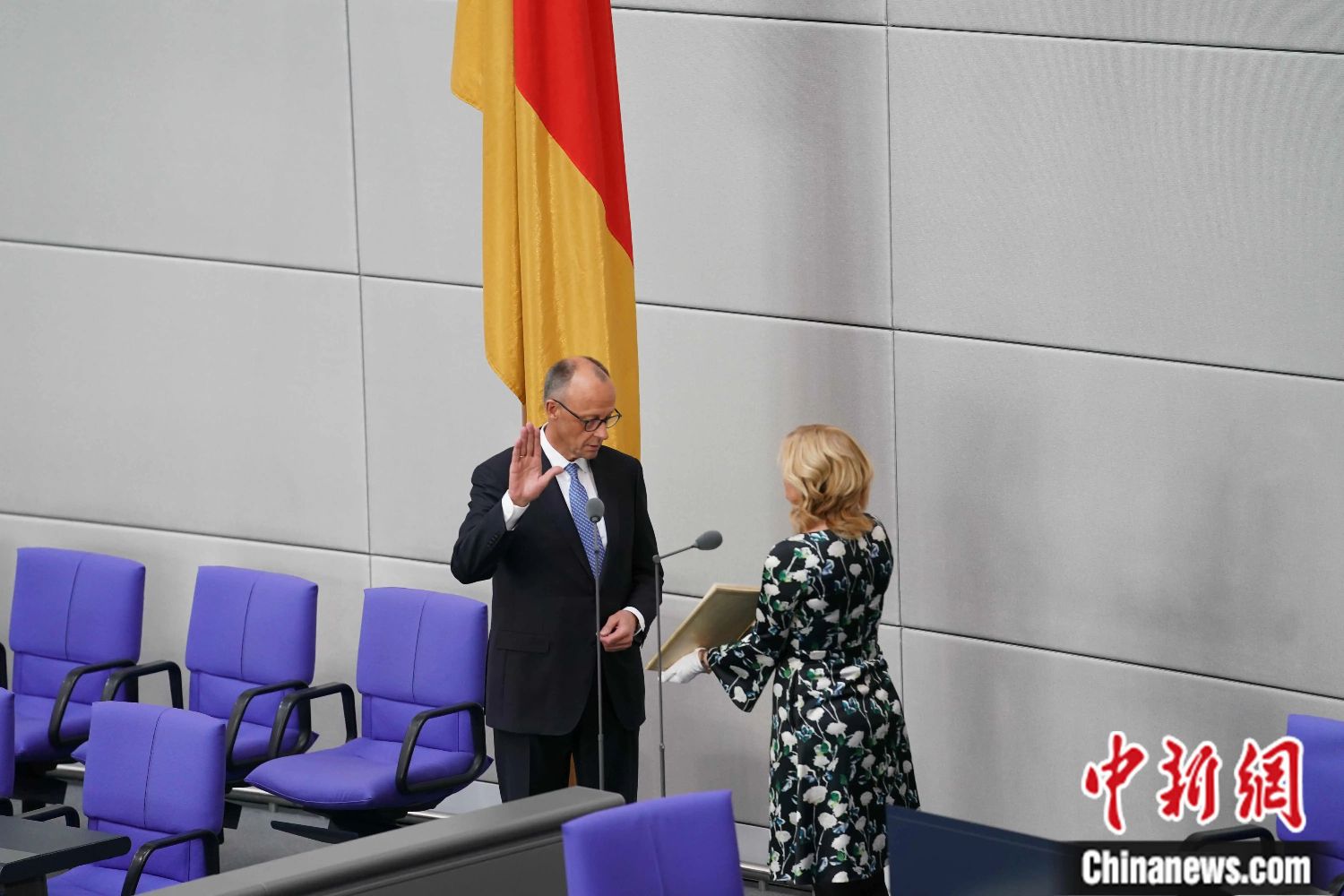 5月6日,德国联邦议院召开全体会议选举新总理。在当日下午举行的第二轮总理选举中,德国联邦议院以325票支持选举默茨为德国联邦总理。图为默茨当日在德国联邦议院宣誓就职。中新社记者马秀秀摄