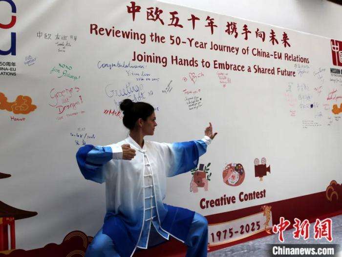 当地时间2025年4月28日,中国驻欧盟使团在比利时布鲁塞尔举行“中欧五十年携手向未来”主题创意大赛颁奖仪式。图为一名来宾摆出功夫造型,在颁奖会场留念。图/中新社