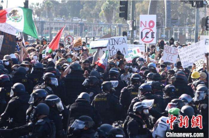 当地时间2025年6月8日,美国加利福尼亚州洛杉矶市中心爆发反搜捕非法移民行动抗议示威,抗议者与警方发生冲突。图/中新社