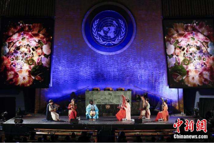 当地时间6月9日,中国在纽约联合国总部举办“文明对话国际日”主题活动。图为来自中国、美国、希腊、塞内加尔的艺术家在“跨越山海的文明对话”文艺演出上表演器乐合奏《美美与共》。图/中新社