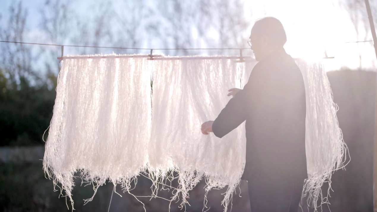 (山东招远龙口粉丝制作技艺传承人在晾晒粉丝)