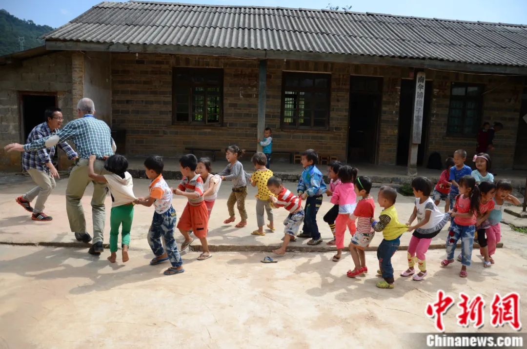 2013年10月,迈克尔·海尔曼(左二)在云南省临沧市镇康县南伞镇与孩子们一起做游戏。图/中新网