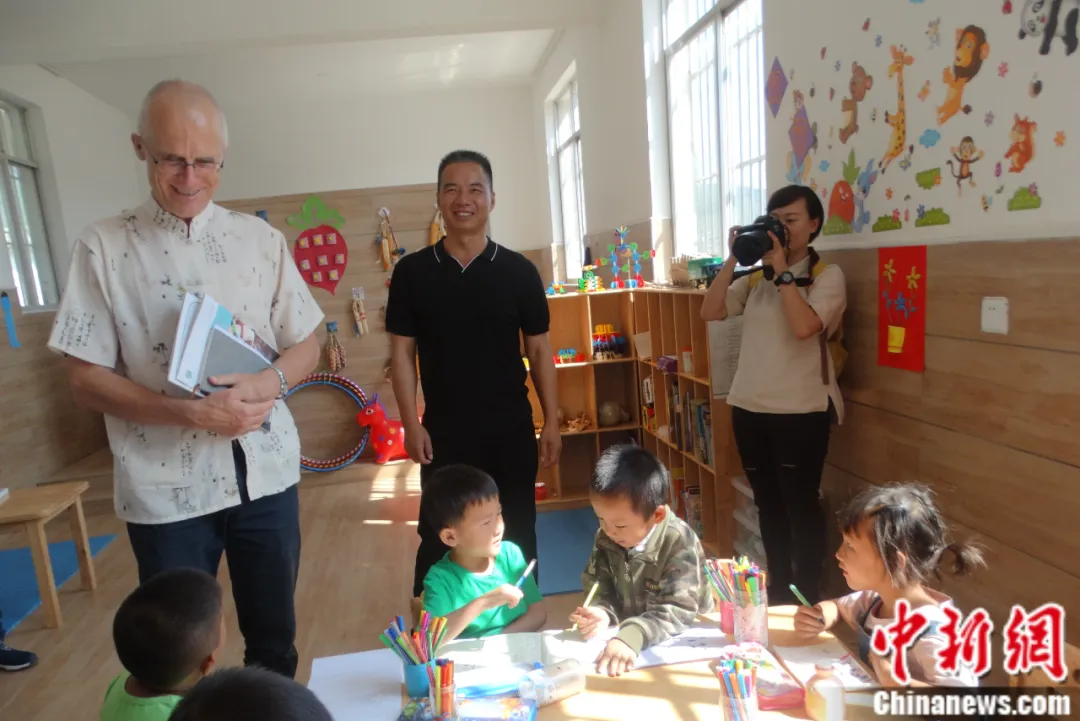 2019年5月,迈克尔·海尔曼(左一)与云南省普洱市宁洱哈尼族彝族自治县一所幼儿园的孩子们互动。图/中新网