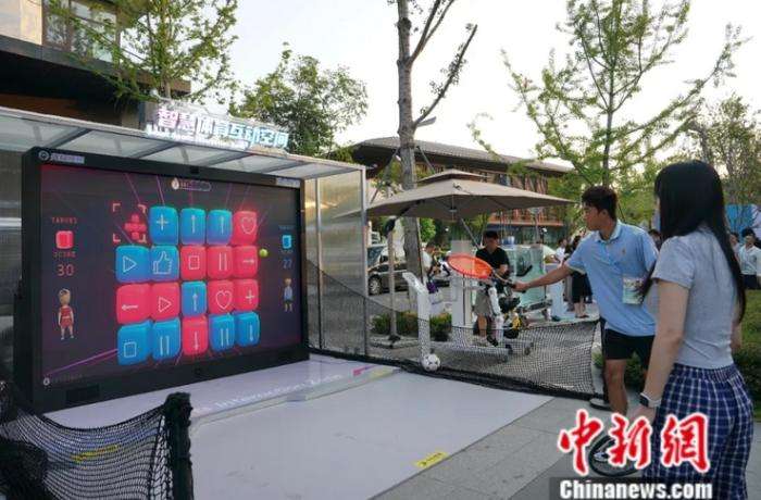 7月30日,四川成都,“科技赋能世运产品展示暨媒体体验日”活动在成都世运村举行。图为参观者体验互动式AI壁球设施。图/中新社