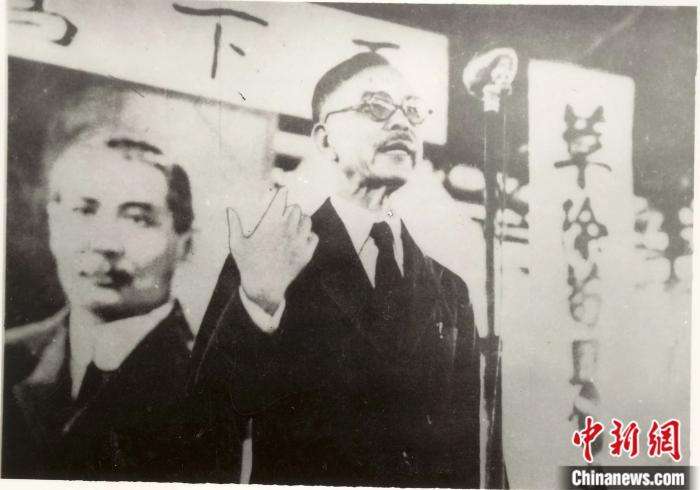 南侨总会公推陈嘉庚为主席。图为陈嘉庚在大会上演说号召华侨支持祖国抗日。华侨博物院供图