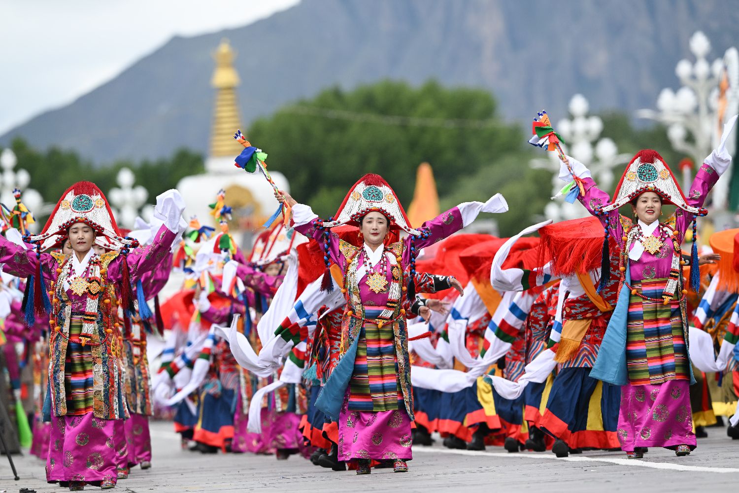 8月21日,西藏自治区成立60周年庆祝大会中的游行表演。图/中新社