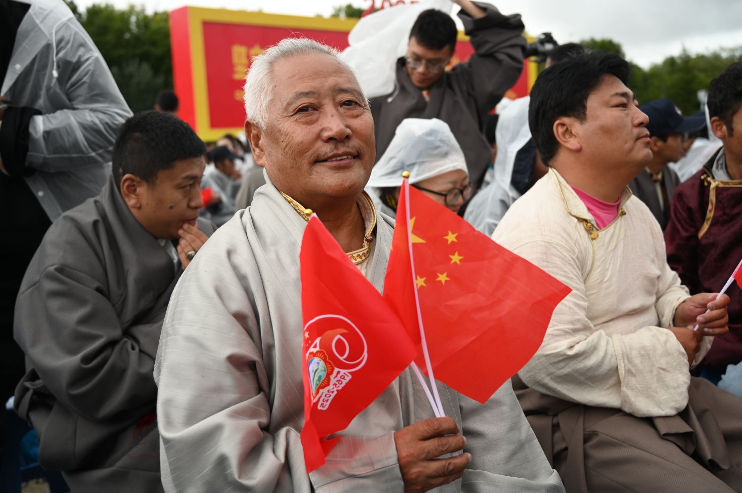 8月21日,拉萨古城居民罗桑群佩在布达拉宫广场参加庆祝活动。图/中新社