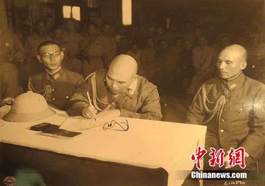 受降代表席上,中方代表昂首挺胸,神情威严