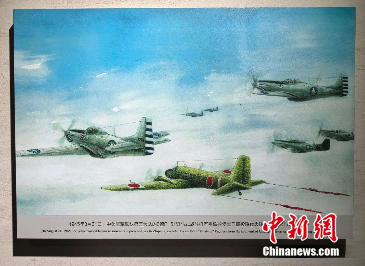 中美空军联队监控日军投降代表降机前往芷江的油画。付敬懿摄
