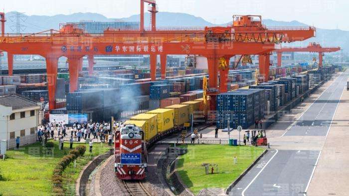 2025年6月,首趟中欧班列(金华—巴希—巴库)跨里海国际运输走廊班列开行。图/中新社发胡肖飞摄