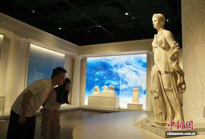 7月27日,四川省广汉市,在三星堆博物馆展出的“古希腊的旅程——希腊考古出土文物精品展”上,参观者观看展出的阿尔忒弥斯雕像。图/中新社