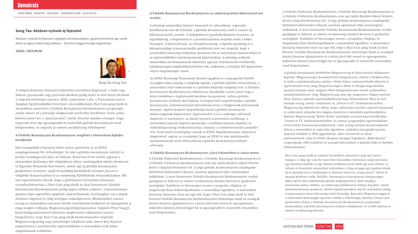 2025年9月20日,驻匈牙利大使龚韬在《匈牙利民主主义者》发表题为《共启全球治理新篇共创人类美好未来》的署名文章,全文如下: