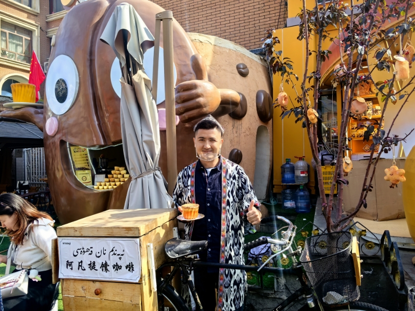 9月23日,亚森·喀吾孜与他曾经的自制咖啡车合影。后方咖啡豆形的建筑是他如今在新疆国际大巴扎的咖啡店。图/中新社