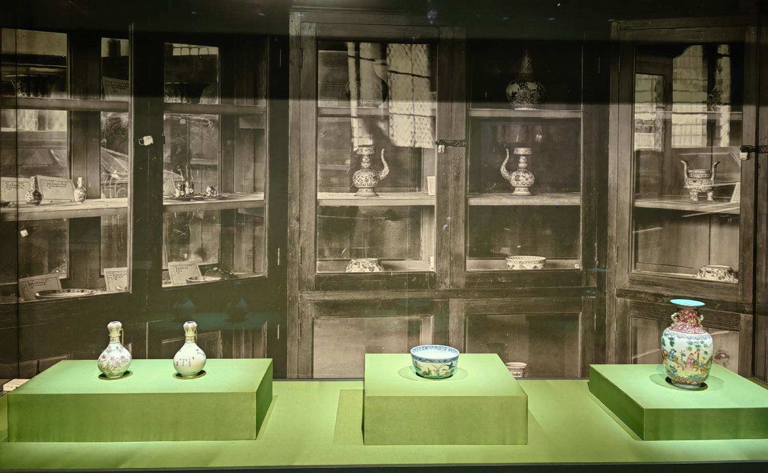 一张拍摄于20世纪30年代的承乾宫瓷器陈列老照片被放大作为背景板,前方展柜中分别陈列着在照片中出现的一对珐琅彩花卉纹蒜头瓶、斗彩鸳鸯莲池图碗和粉彩婴戏图双耳撇口瓶。