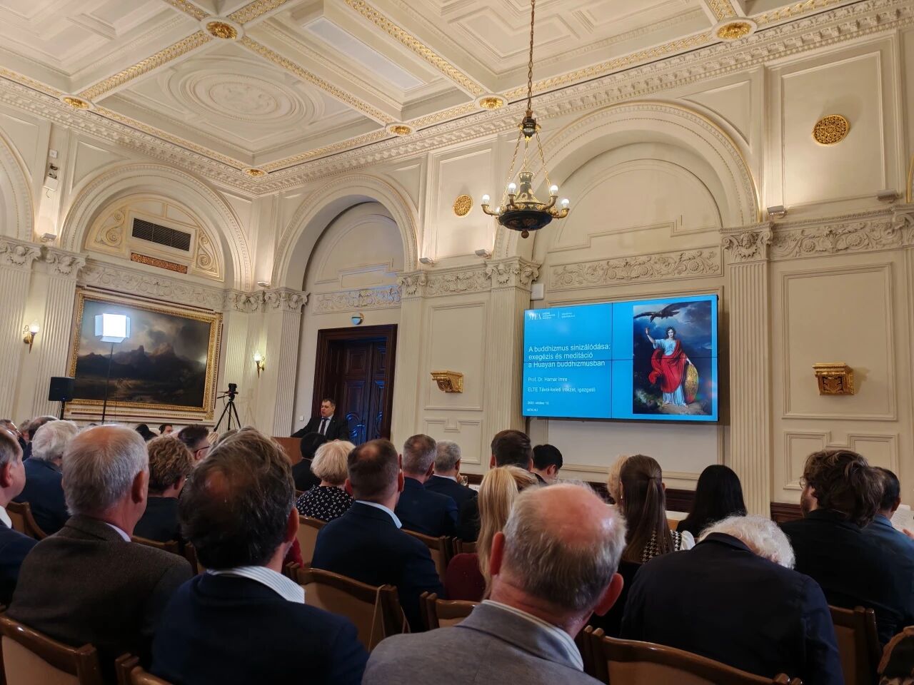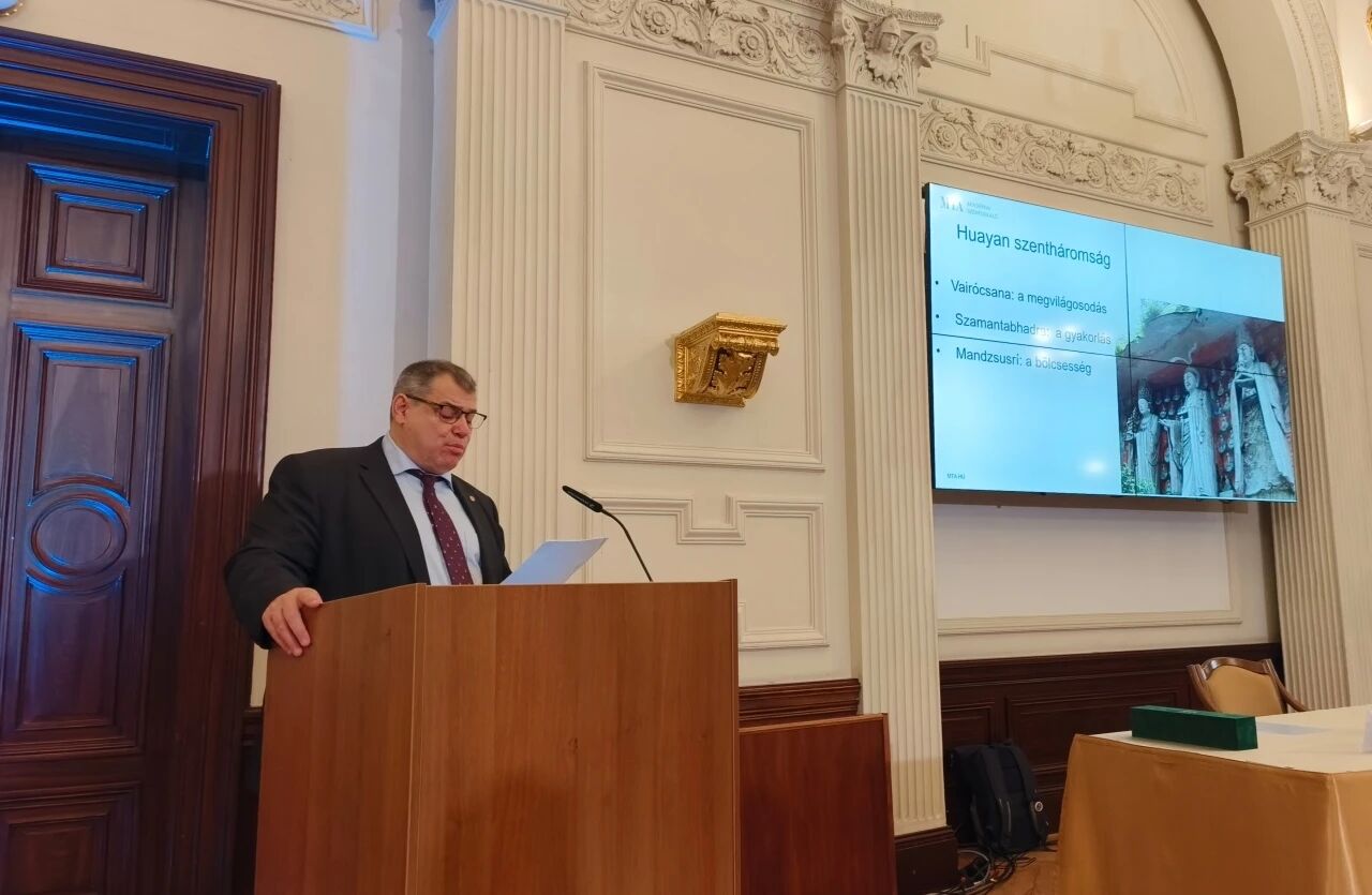 当地时间10月13日,匈牙利科学院院士、罗兰大学亚洲事务专员、罗兰孔院匈方院长郝清新(Dr.Hamar Imre)教授在匈牙利科学院总部举办了题为《佛教的中国化:华严宗中的诠释与禅观》的学术讲座,约120名中匈各界代表受邀出席了本次活动。讲座伊始,郝清新教授回顾了佛教传入中国的历史背景。他指出,在长期的对话与互动中,佛教不仅影响了中国社会与文化,其自身教义与修行方式也经历了深刻变革。这一“佛教中国化”的过程并非单向的“征服”,而是双向的融合,并最终形成了具有中国特色的佛教宗派,如华严宗、禅宗等。