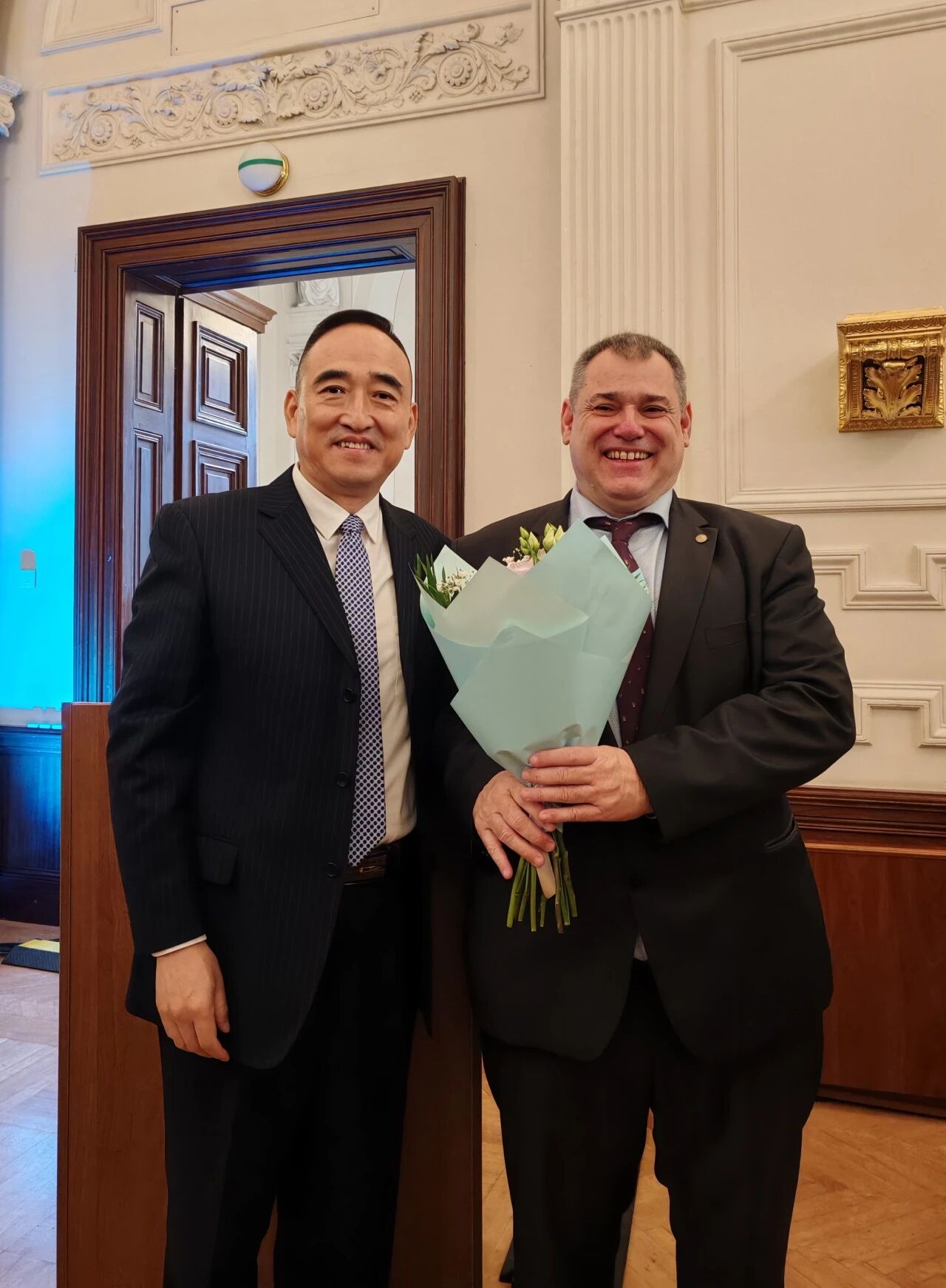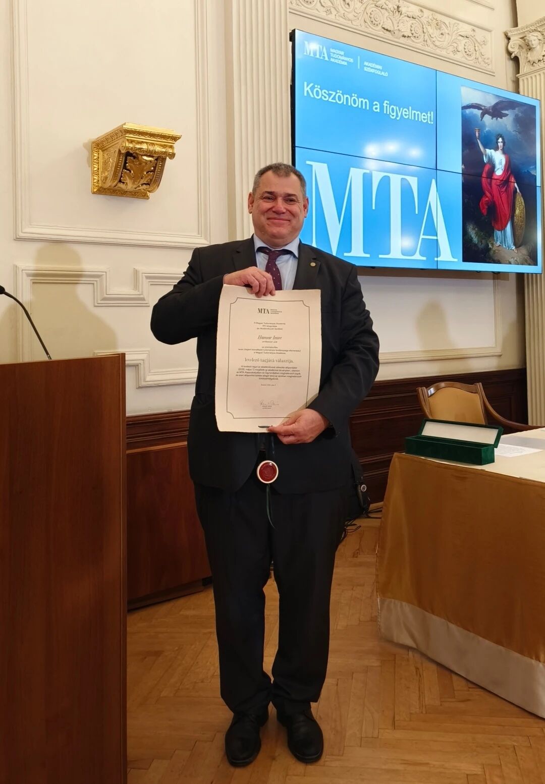 讲座结束后,匈牙利科学院语言与文学部主任博尔索斯·包拉兹(Dr.Borsos Balázs)为郝清新教授颁发了匈牙利科学院学术会员资格证书。
