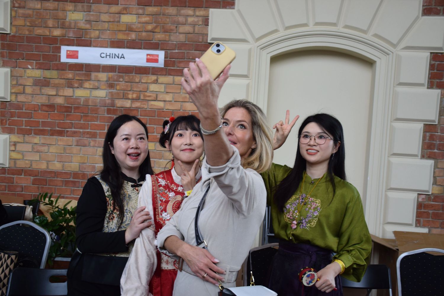 外国朋友争相与使馆身着传统服饰工作人员合影