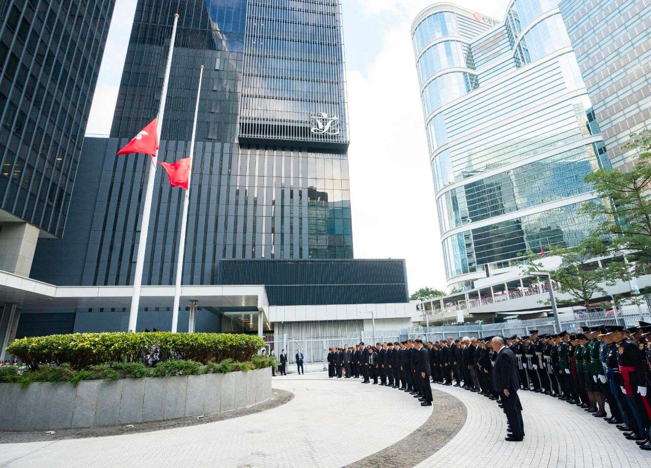 11月29日,香港特区政府在总部大楼前举行悼念活动,向大埔宏福苑火灾罹难者志哀。图/中新社
