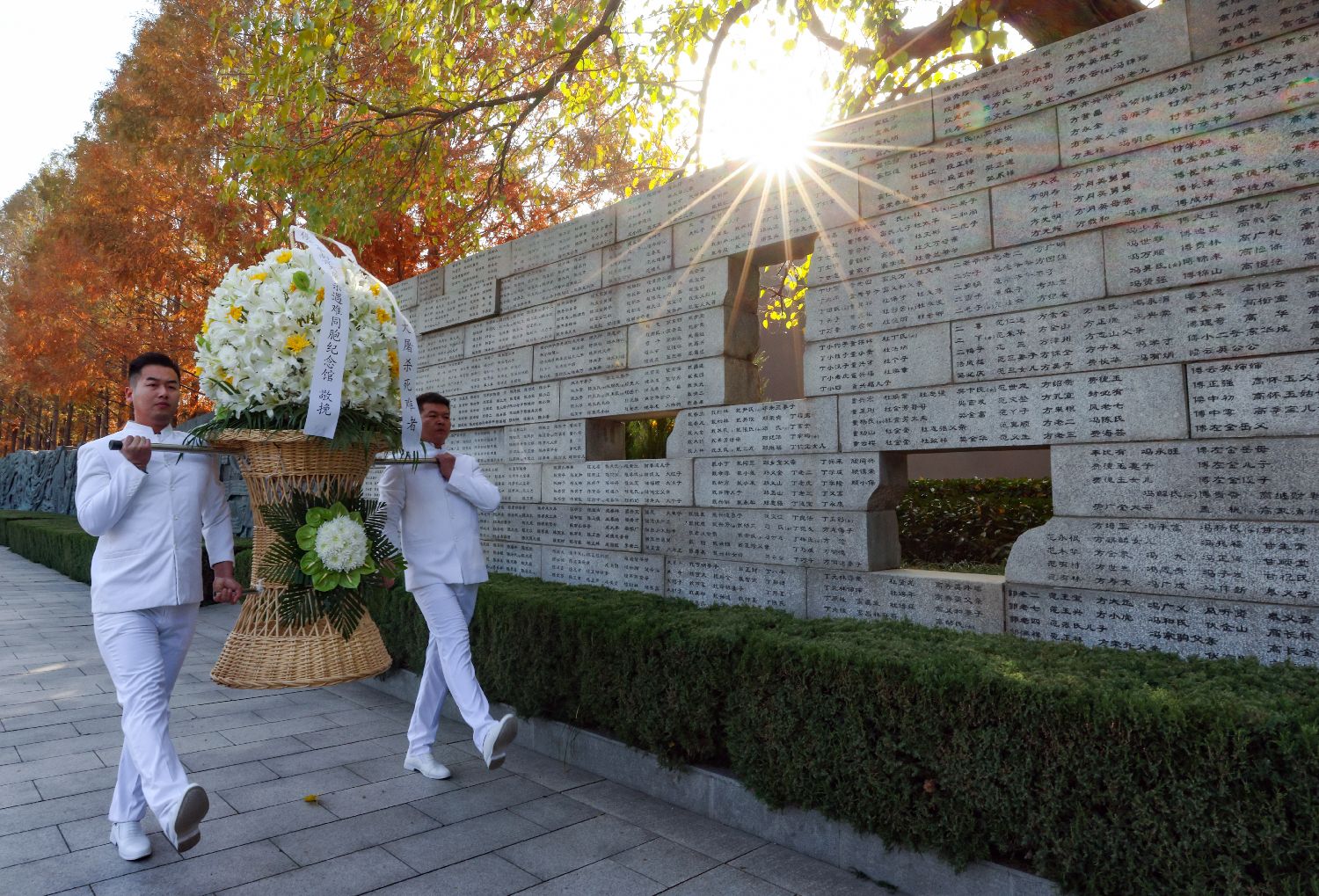 肃穆乐声中,纪念馆向南京大屠杀死难同胞敬献花篮。全体人员向南京大屠杀死难同胞三鞠躬,依次走到“哭墙”前,将手中的菊花轻轻摆在地上。