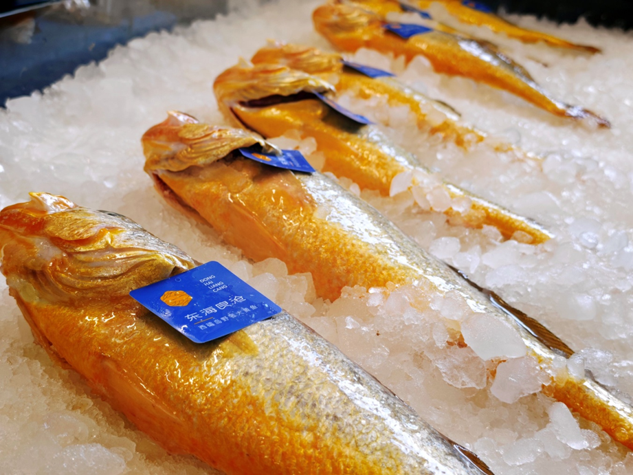 图为“线下大黄鱼销售促消费活动”中,商户展示的冰鲜大黄鱼。图/吴允杰 摄
