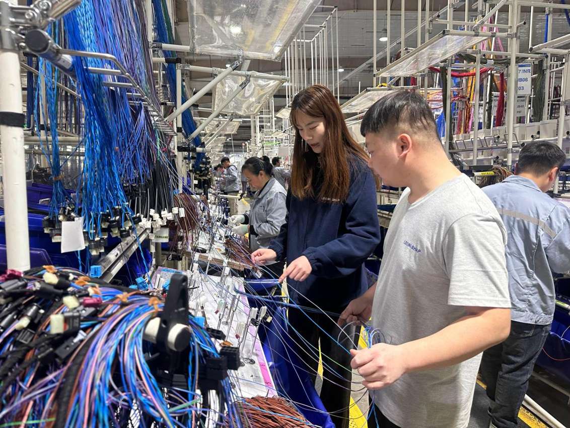 图为河北廊坊三河市入企干部与企业负责人在车间内检查作业情况。图/高澍 摄