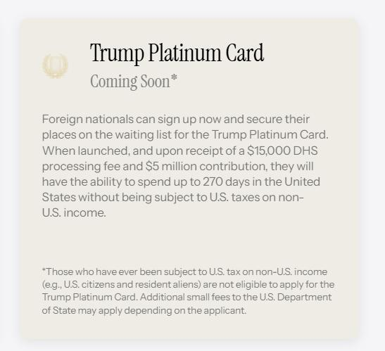 美国政府还预告了500万美元的“铂金卡”选项,承诺“持卡人每年就可在美停留长达270天,且无需就海外收入缴纳美国税款”。