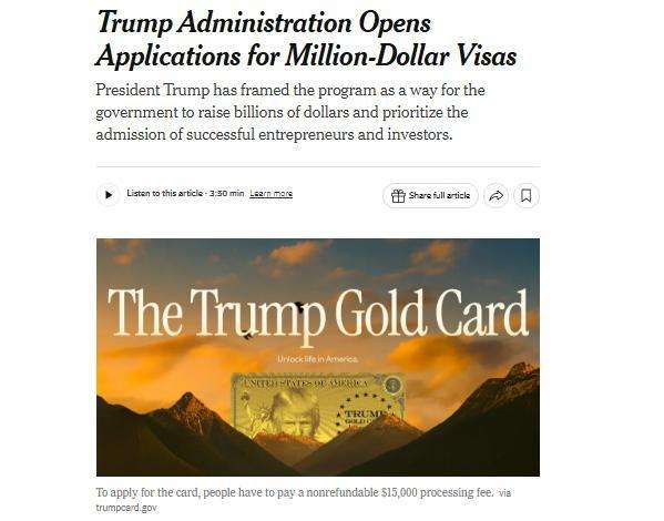 根据特朗普的声明,美政府正式接受“黄金卡”签证计划申请。所谓“黄金卡”计划,旨在通过收取高昂费用,鼓励全球富人移居美国并获得居留许可。