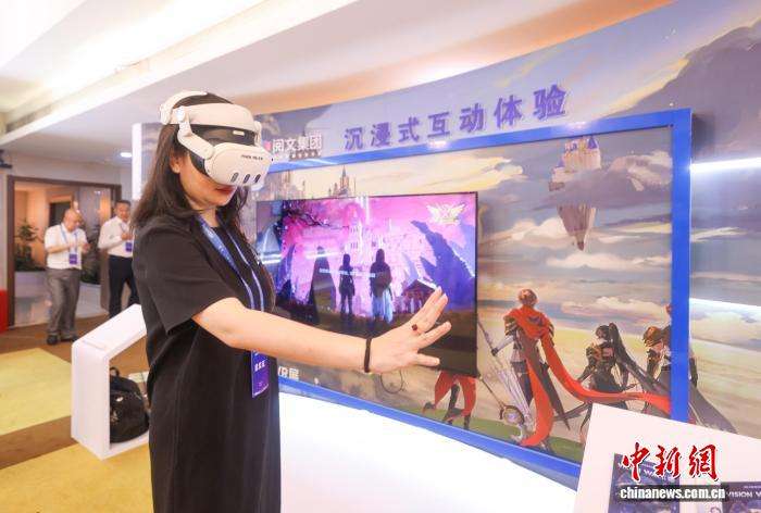 7月17日,第八届中国“网络文学+”大会在北京经济技术开发区举行。图为参会嘉宾在会场外体验VR互动游戏。 中新社记者贾天勇摄