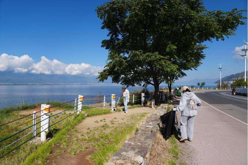 2025年10月14日,云南大理,参与“捡垃圾换咖啡活动”的市民沿着洱海捡拾垃圾。中新社记者刘冉阳摄