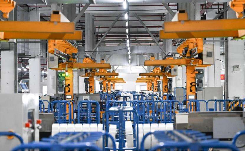 2025年7月8日,新凤鸣集团湖州基地内,自动化设备作业中。通过引进智能络筒、智能质检、巡检机器人等装备,借力数字技术和人工智能技术,该基地生产效率提高20%。中新社记者王刚摄