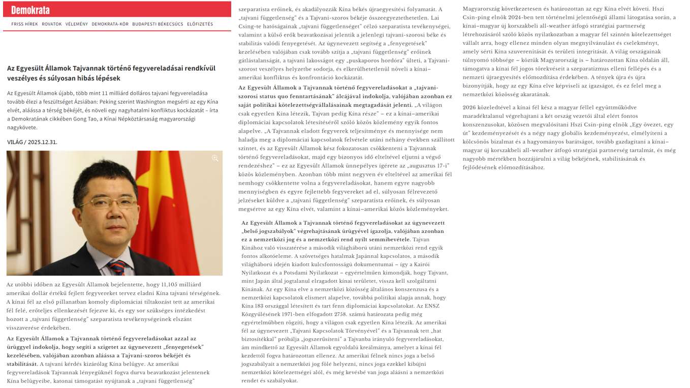 2025年12月31日,驻匈牙利大使龚韬在匈主流媒体《匈牙利民主主义者》发表题为《美国对台军售是极其危险的错误行径》的署名文章,全文如下: