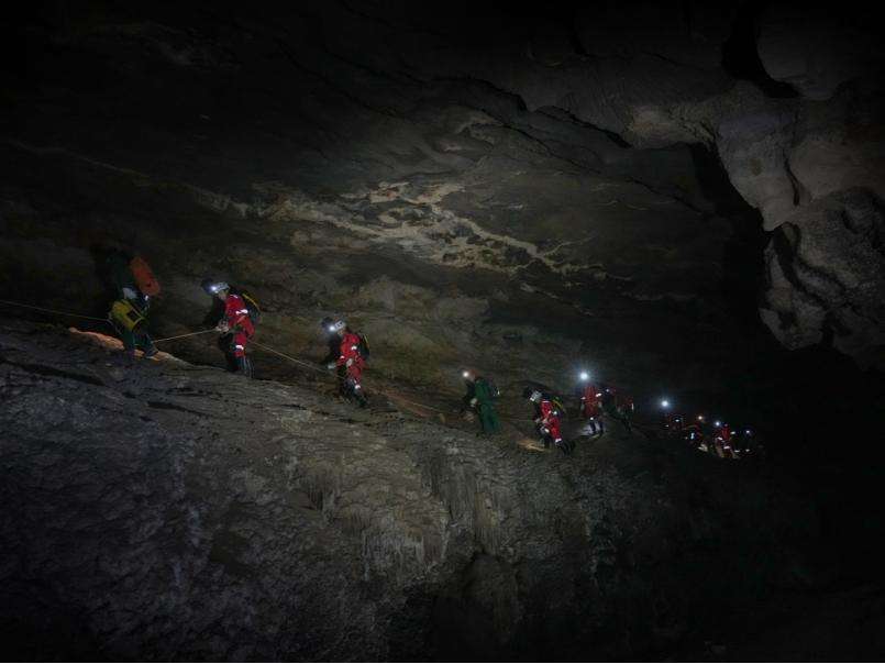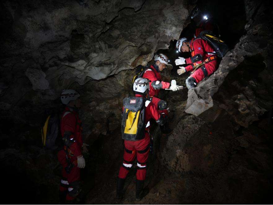 2025年12月,中国航天员在洞穴训练中开展团队协作训练。图/中新社