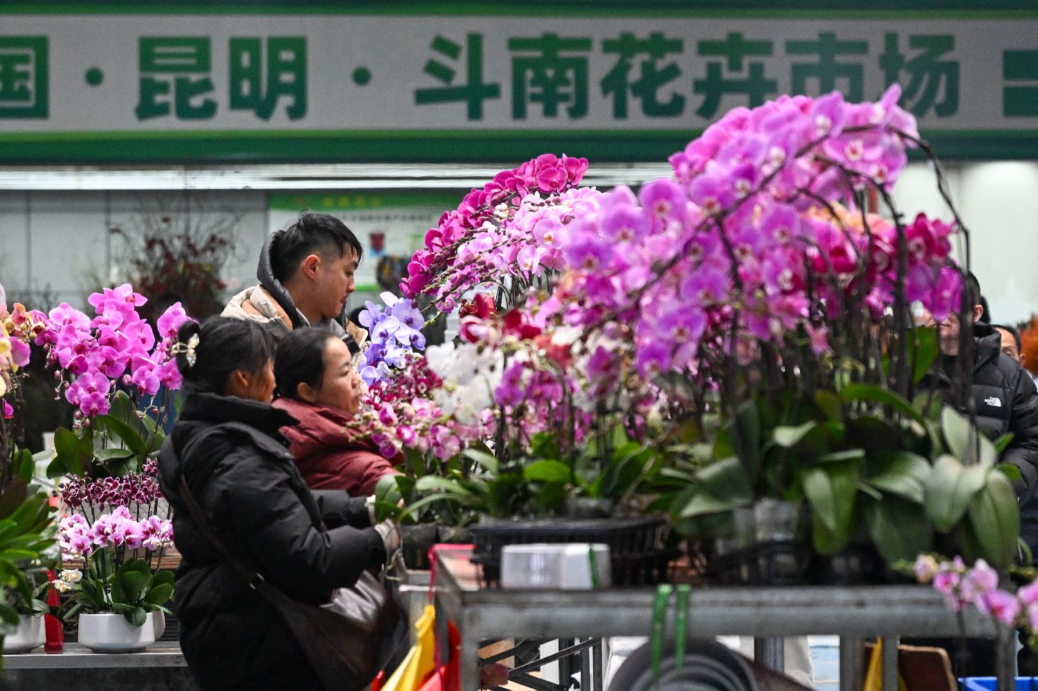 1月7日,消费者在云南昆明选购蝴蝶兰。随着2026年春节临近,昆明斗南花卉市场内售卖的蝴蝶兰、冬青、黄金香柳、黄金果等年宵花受到消费者青睐。图/中新社