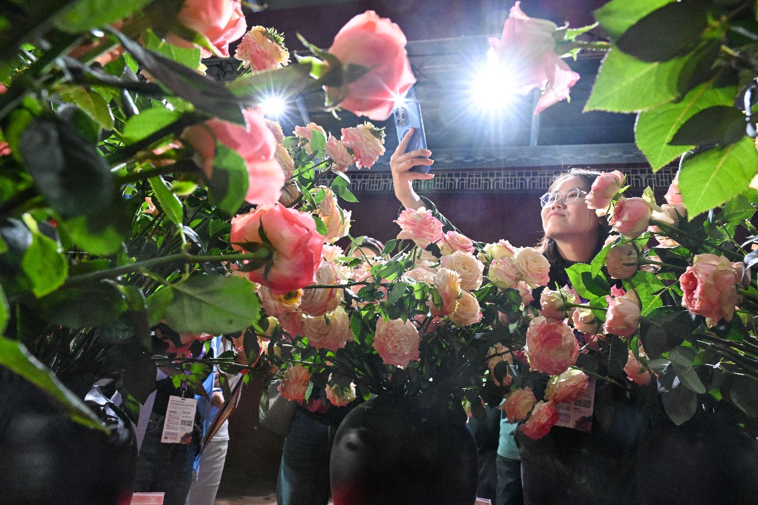2025年9月19日,第二十三届中国昆明国际花卉展在云南省昆明市开幕,多种月季鲜切花吸引观众拍照。图/中新社