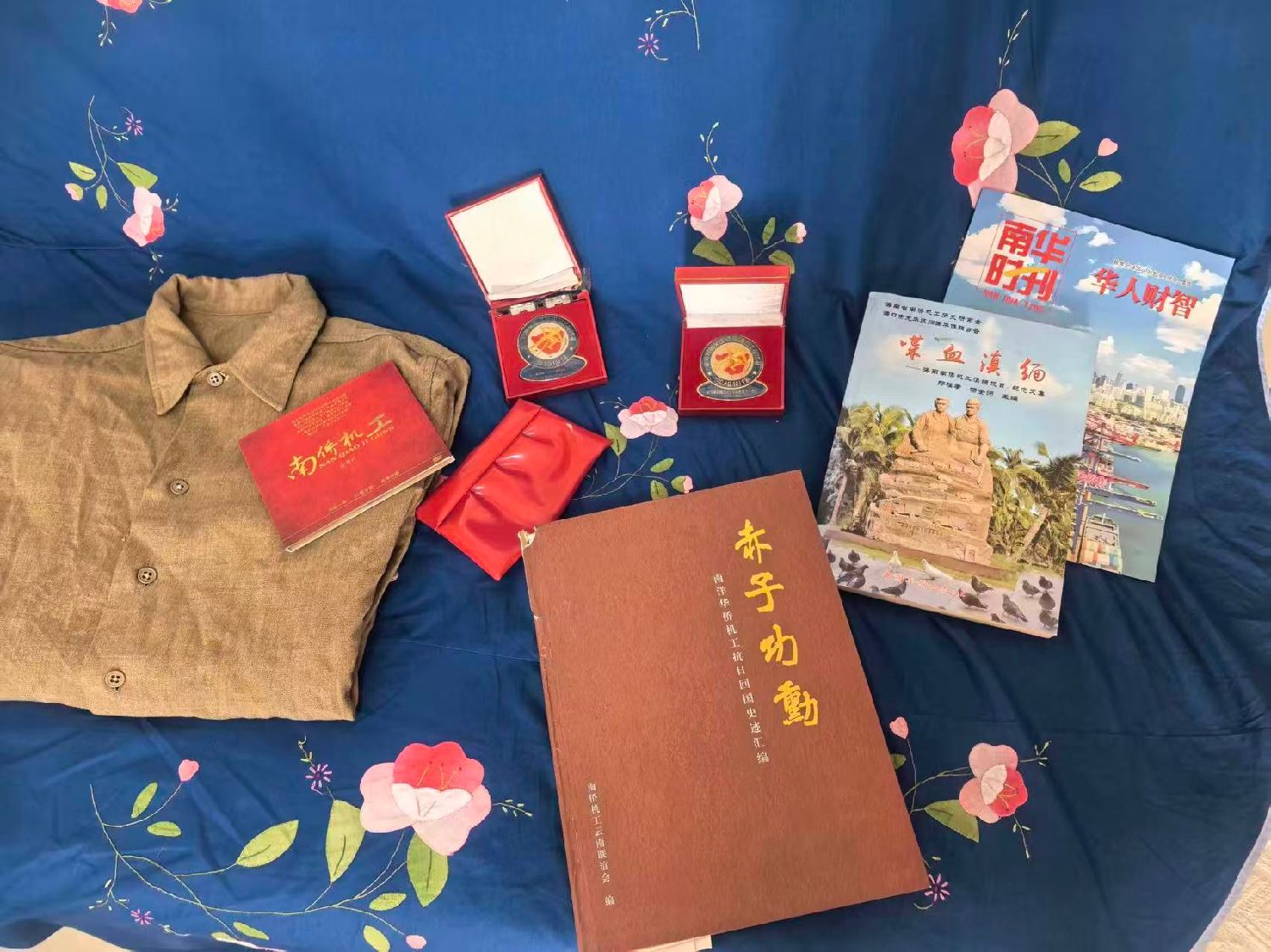 皮包之外,符桂英家中还有两枚“南洋华侨机工抗日回国服务六十周年”的纪念章。符桂英的爱人罗保章,同样是南侨机工后人。1939年,罗保章的父亲罗豫川与罗开瑚、罗豫江结伴,作为第八批南侨机工回国参战。