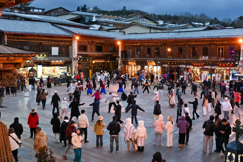 2025年3月1日,游客在云南迪庆的独克宗古城与当地居民一同跳舞。图/中新社