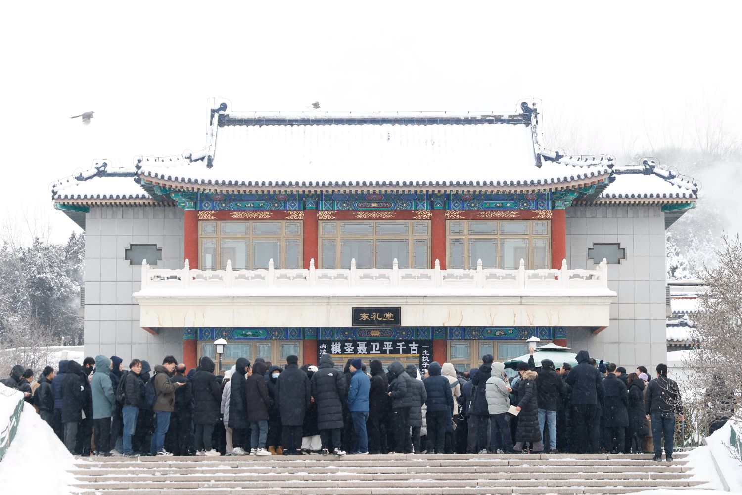 风雪中,送别队伍蜿蜒百米,等候区的长廊也站满了人。约有千人现场送别“棋圣”最后一程。