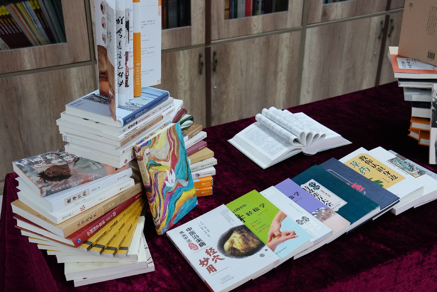 近日,塔吉克斯坦中文图书馆在塔吉克斯坦民族大学孔子学院开馆。图为开馆当日,现场展示的馆藏书籍。图/中新社