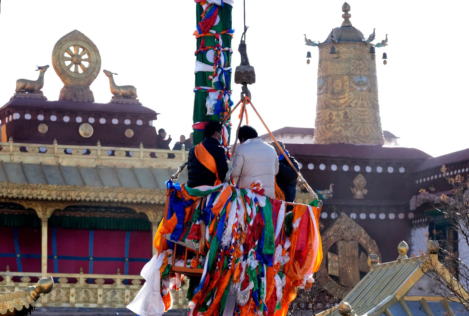 2月5日,西藏拉萨大昭寺周边,工作人员乘坐吊车更换经幡柱上的经幡。图/中新社