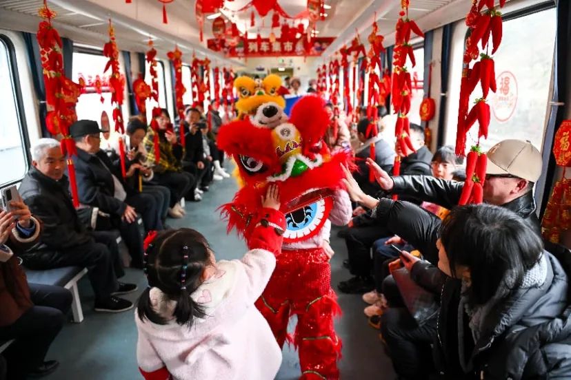 2024年2月23日,5630次列车上,旅客与舞狮互动。当日,在元宵节到来之际,形式多样的闹元宵活动在贵州遵义开往重庆西的5630次公益性“慢火车”上举行,吸引不少旅客参与其中,感受浓浓节日气氛。中新社记者何蓬磊摄