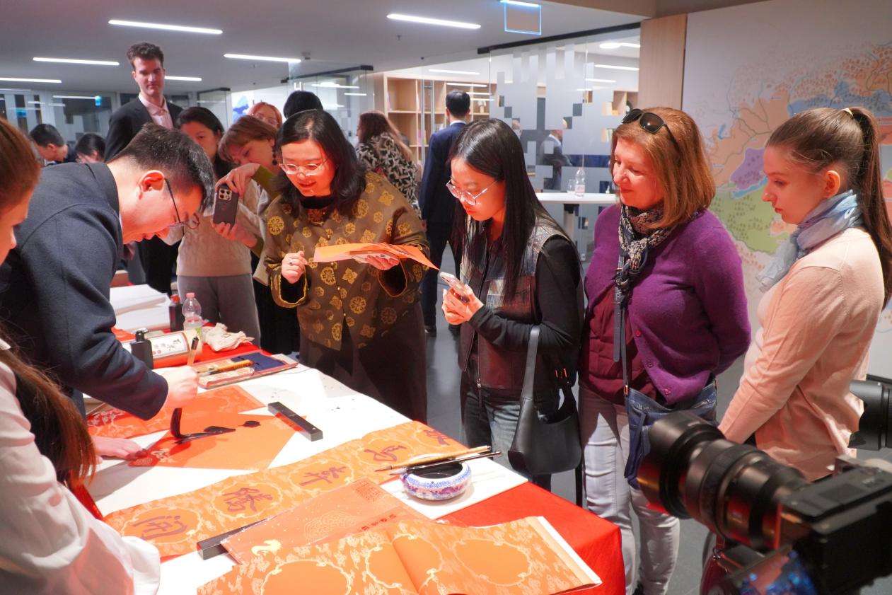 中场茶歇期间,书法家温景超现场书写“福”字与对联作品赠予观众。笔墨之间,汉字结构之美与线条韵律之妙令匈牙利观众驻足赞叹。茶香与墨香交织,为交流增添了温润的人文气息。
