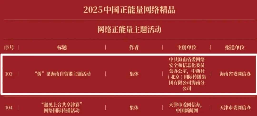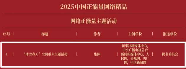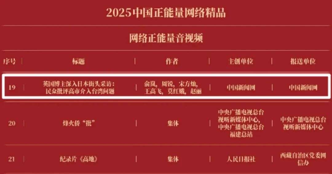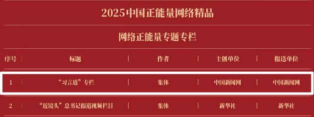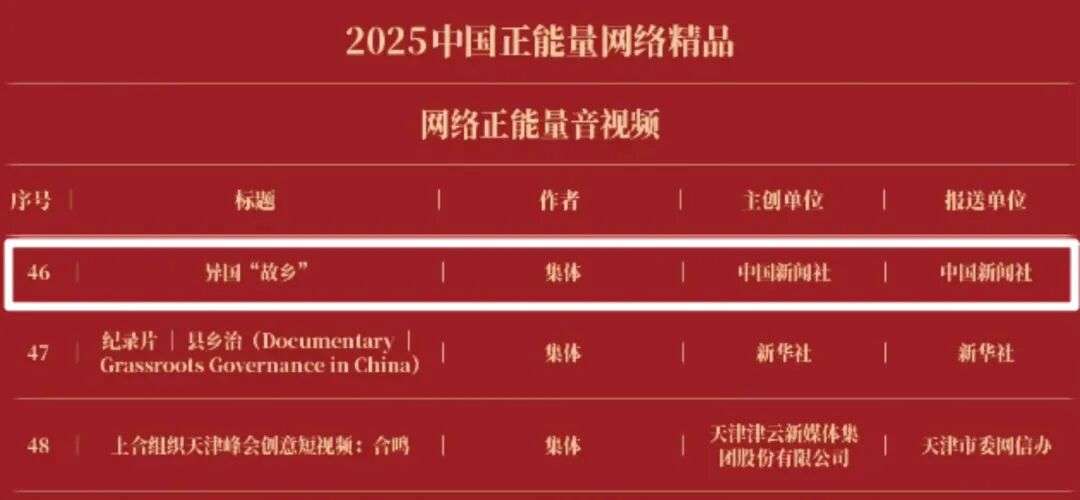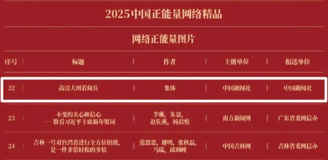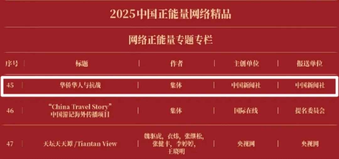 《“新漫评”系列漫画》《“三里河”专栏》入选2025中国正能量网络正能量十佳网络精品。《高清大图看阅兵》《青春的关键词,是他们的模样》入选2025中国正能量网络精品网络正能量图片;《英国博主深入日本街头采访:民众批评高市介入台湾问题》《异国“故乡”》入选2025中国正能量网络精品网络正能量音视频;《“习言道”专栏》《华侨华人与抗战》入选2025中国正能量网络精品网络正能量专题专栏;《“冰雪春天”全网重大主题活动》《“义利天下”网上国际传播活动》《“探店1天”系列报道》《“侨”见海南自贸港主题活动》《“遇见上合共享津彩”网络国际传播活动》入选2025中国正能量网络精品网络正能量主题活动。
