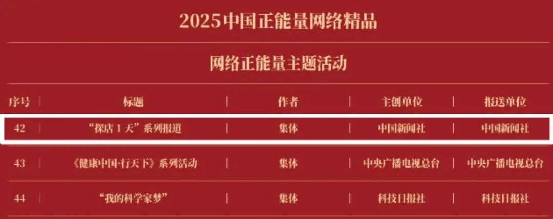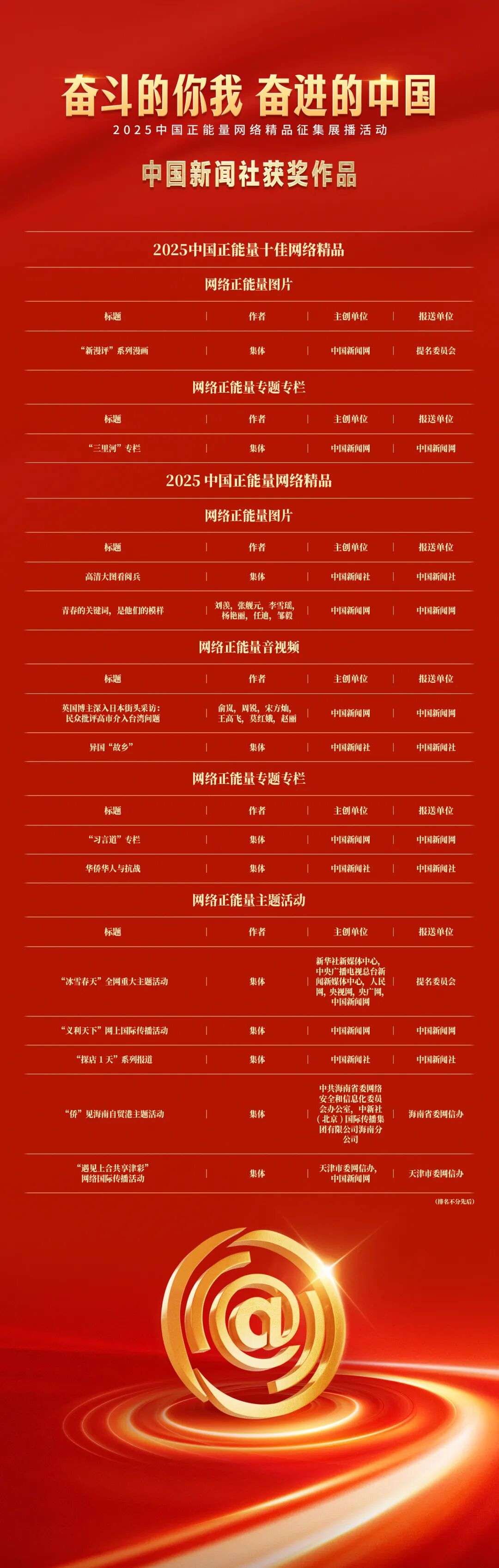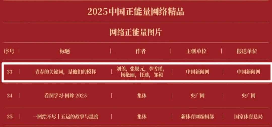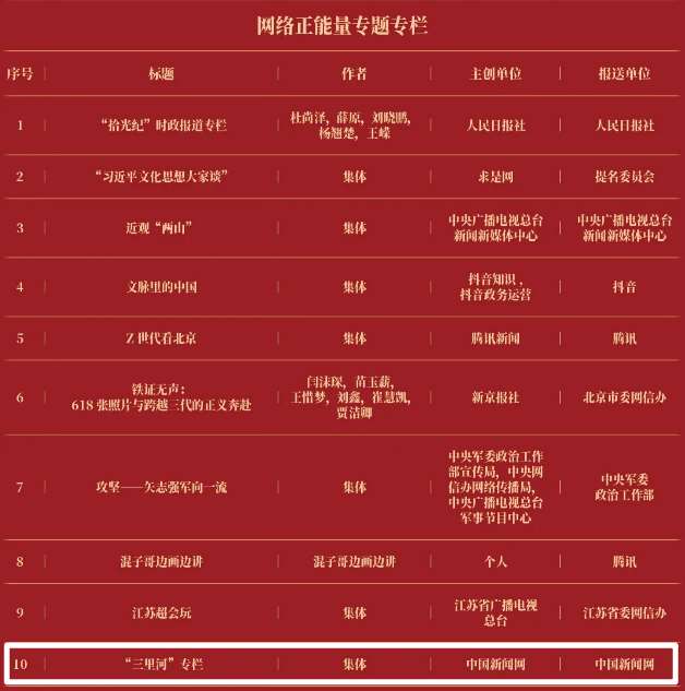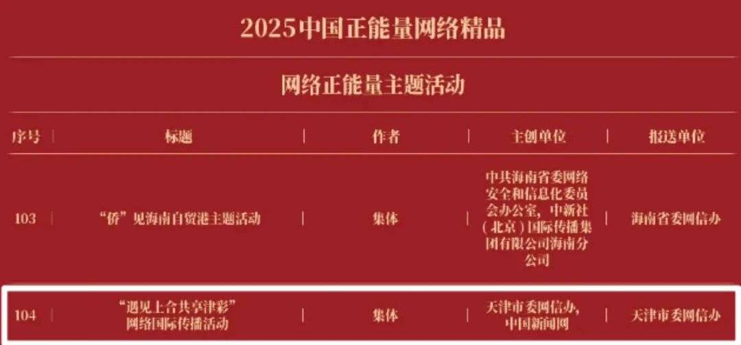 《“新漫评”系列漫画》《“三里河”专栏》入选2025中国正能量网络正能量十佳网络精品。《高清大图看阅兵》《青春的关键词,是他们的模样》入选2025中国正能量网络精品网络正能量图片;《英国博主深入日本街头采访:民众批评高市介入台湾问题》《异国“故乡”》入选2025中国正能量网络精品网络正能量音视频;《“习言道”专栏》《华侨华人与抗战》入选2025中国正能量网络精品网络正能量专题专栏;《“冰雪春天”全网重大主题活动》《“义利天下”网上国际传播活动》《“探店1天”系列报道》《“侨”见海南自贸港主题活动》《“遇见上合共享津彩”网络国际传播活动》入选2025中国正能量网络精品网络正能量主题活动。