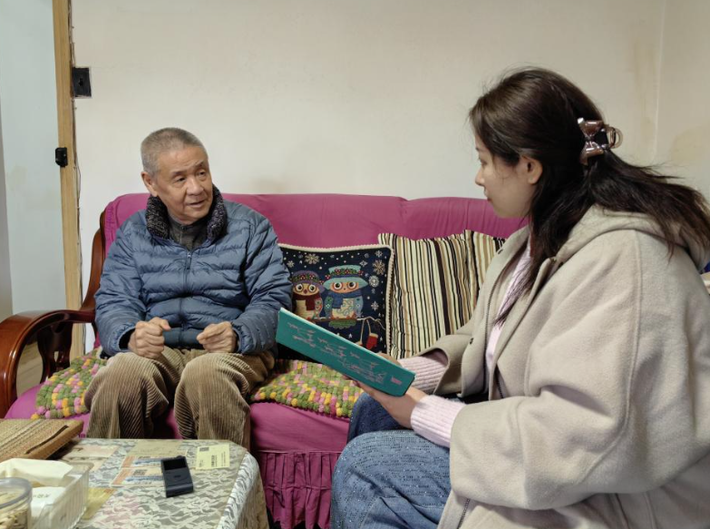 近日,侨眷王弘毅在上海市普陀区的家中与新侨范卓然(右)讲述家族往事。图/中新社