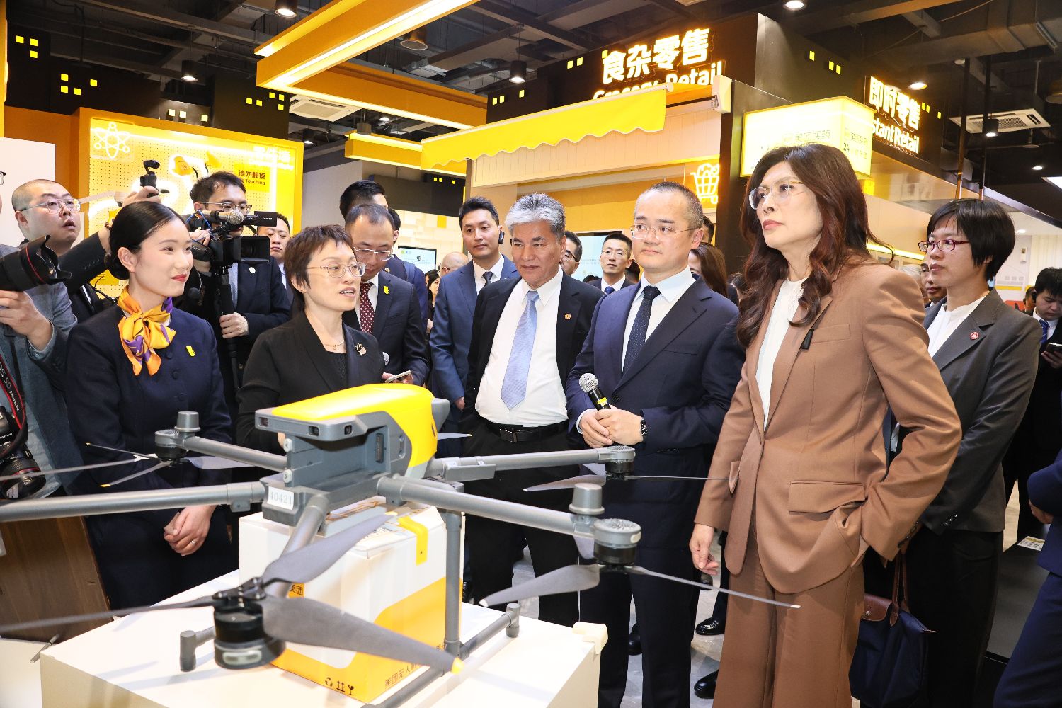 随后,一行人来到一架无人机前。据介绍,这是用于美团无人机外卖的机型。在大陆鼓励发展低空经济政策推动下,该项业务成为美团代表性商业落地案例。截至2025年底,美团已在上海、深圳、北京、广州、香港和迪拜等城市开通70条航线,并累计完成订单超78万,服务覆盖办公、社区、景区、市政公园、校园、图书馆等多种场景,与超过千家品牌商合作,为用户提供逾16万种商品。